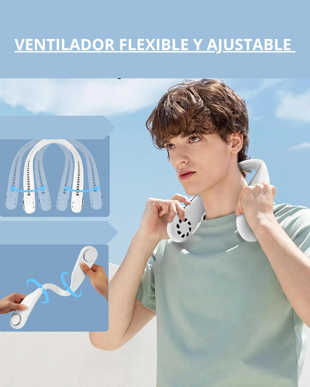 Su diseño sin aspas evita tirones de cabello o accidentes. Está hecho con silicona suave y flexible, se ajusta cómodamente a tu cuello y es apto para todas las edades.